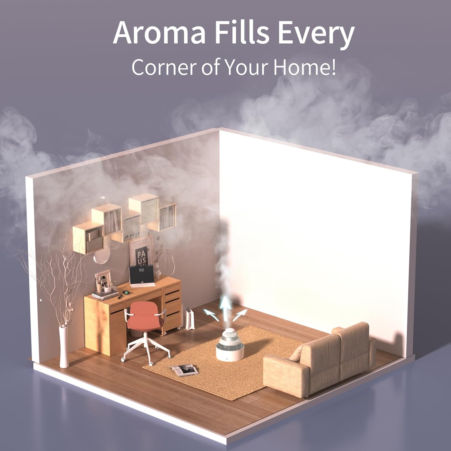 ضيف أي زيت عطري بتحبه، والفواحة هتنشره في الجو بلُطف مع بخار خفيف يخلي الأوضة كلها ريحة مريحة ومهدّئة